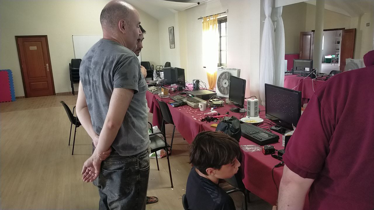 Como en cada encuentro, no todo giró en torno a las máquinas. En las mesas se desplegaron refrescos, aperitivos y dulces que ayudaron a combatir el calor. Fue una tarde particularmente calurosa, pero un ventilador providencial de DaRKND alivió el ambiente (si bien es cierto que en muchas ocasiones lo orientaba hacia él :). Entre sorbo y sorbo, los asistentes compartieron anécdotas, compararon trucos de reparación, recordaron revistas desaparecidas y se rieron de los bugs y pantallazos que aparecían en los equipos más rebeldes.