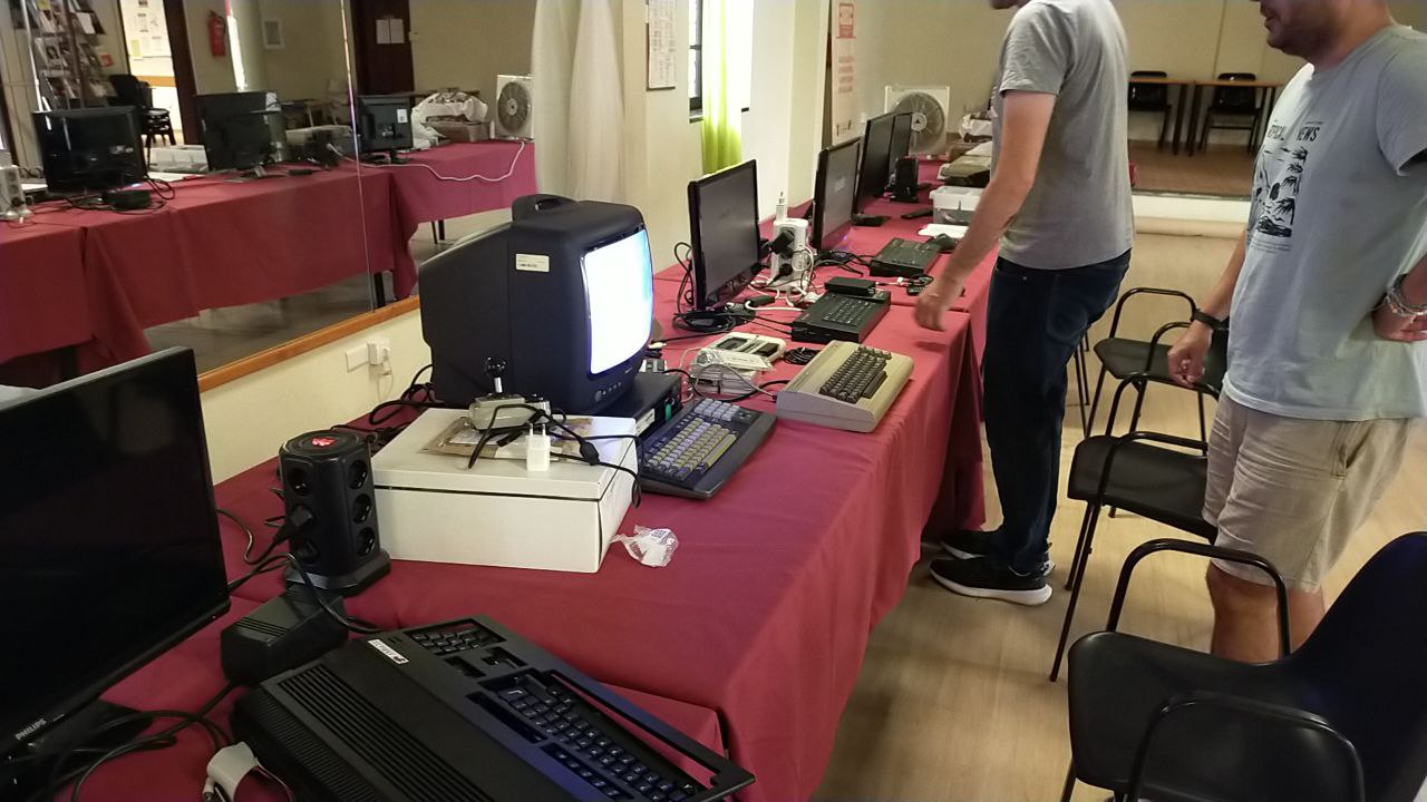Nada más entrar en la sala, lo primero que impresionaba era la organización casi ceremonial de los equipos. Diez pantallas distribuidas en cuatro mesas formaban un mapa de memorias electrónicas. Allí convivían Amiga 500, Spectrum +2 y +3, Commodore 64, Amstrad CPC 6128, MSX 8020 y otros modelos que, cada uno a su manera, marcaron la infancia y la juventud de varias generaciones.