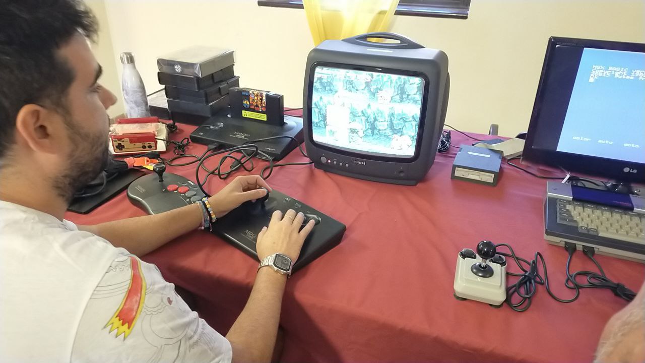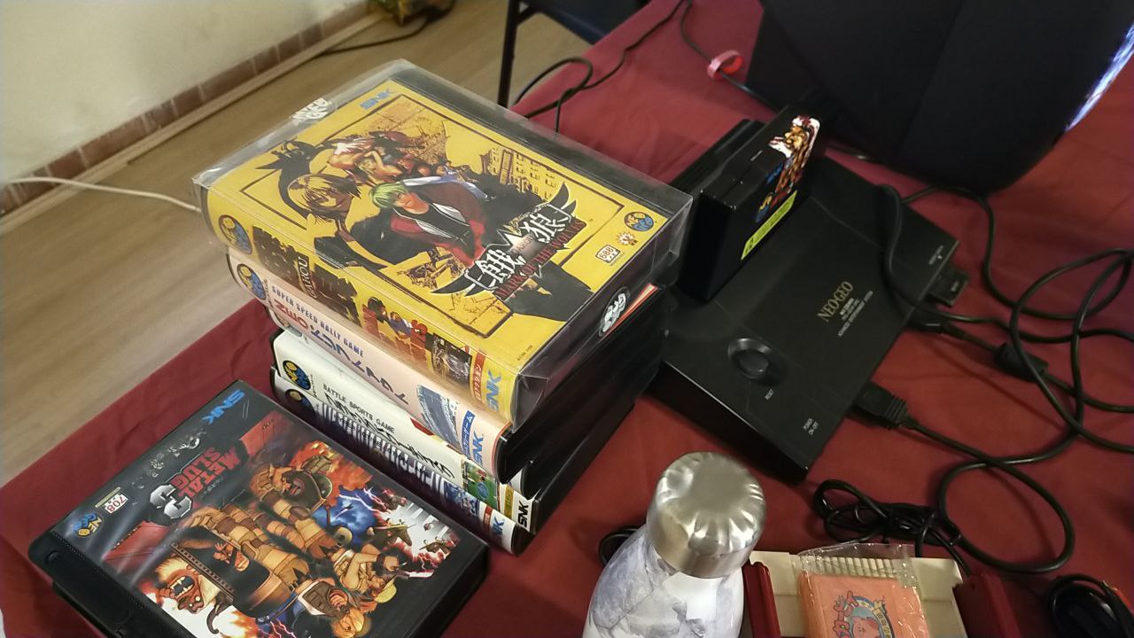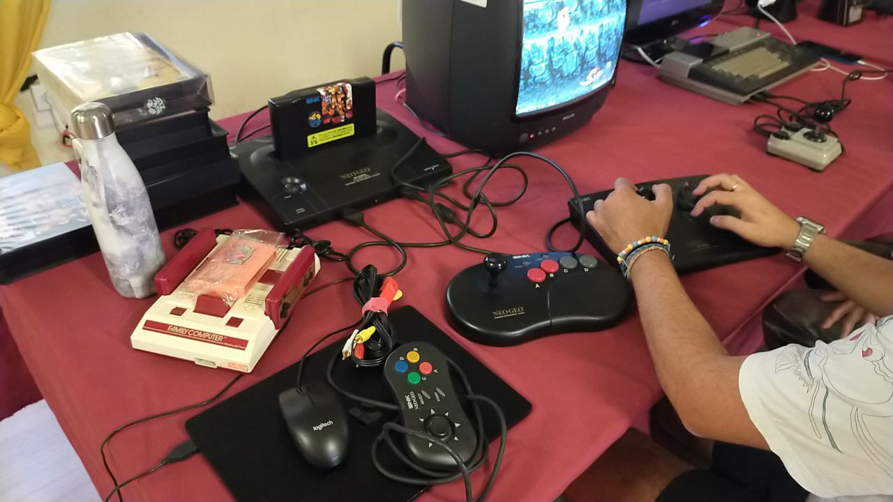 El protagonista absoluto del encuentro fue sin duda el usuario DarkND, que llegó con nada menos que una Neo Geo AES, acompañada de cartuchos originales y mandos auténticos, uno de ellos perteneciente a la versión de Neo Geo CD.