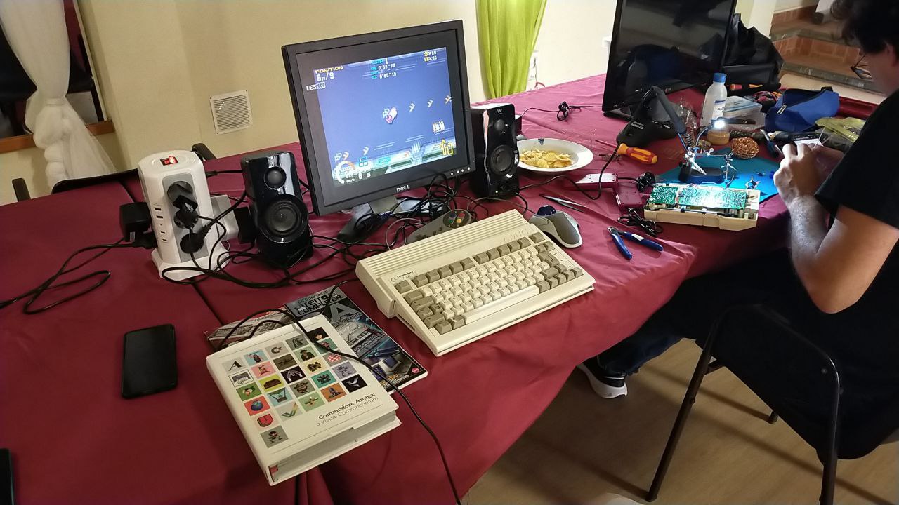 Uno de los experimentos más curiosos del encuentro lo protagonizó Angelo, que presentó una carcasa de Amiga 600 con una Raspberry Pi en su interior, corriendo la distribución PiMiga, un sistema que emula de forma completa el entorno Amiga.