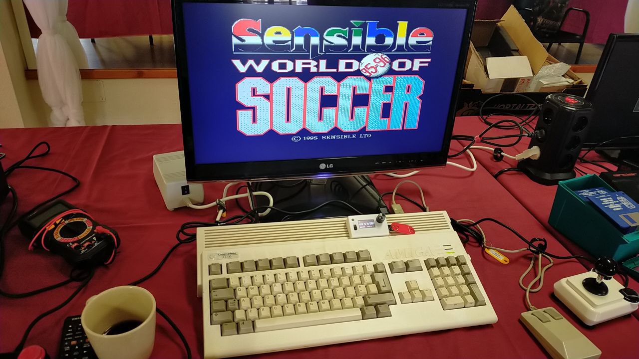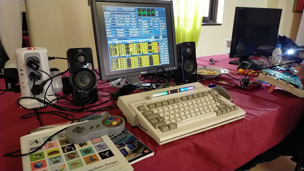 Gracias a esta configuración, los asistentes pudieron disfrutar de juegos como Sensible Soccer o del clásico programa de composición musical ProTracker, acompañado por un dispositivo de salida de sonido de alta calidad que hizo las delicias de los presentes. Angelo también llevó varios libros sobre Amiga, entre ellos uno de sus favoritos, dedicado al desarrollo de software y hardware del mítico sistema de Commodore.