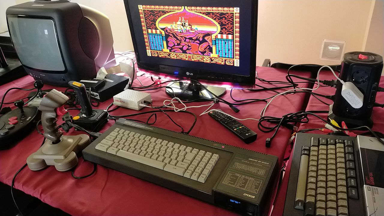 Por su parte, Miguel volvió a traer su inseparable Amstrad CPC 6128, mostrando además una nueva fuente de alimentación moderna que sustituía la original de Amstrad, ofreciendo voltajes estables de 5V y 12V tanto para el ordenador como para la Gotek integrada. Puso en marcha clásicos como Prince of Persia, con su característico colorido y animación fluida, recordando por qué el CPC sigue siendo una de las joyas más queridas de los 8 bits.