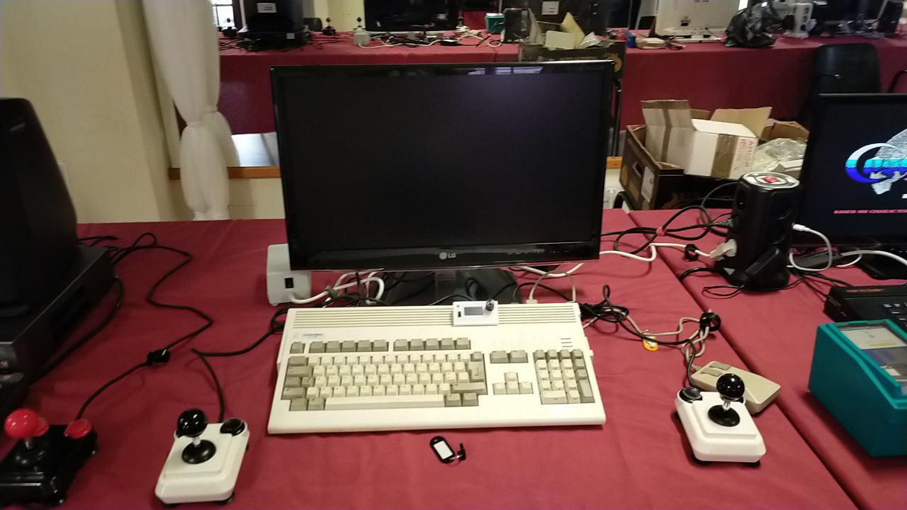 Ayoze dedicó buena parte de la jornada a continuar sus pruebas con Gotek en ordenadores Amiga 500, después de la incidencia ocurrida en la reunión anterior, donde un mal conexionado de la línea de 12V provocó el cortocircuito del pendrive conectado al dispositivo. En esta ocasión, se realizaron nuevas pruebas con un pendrive recién preparado, pero la Gotek seguía sin funcionar.