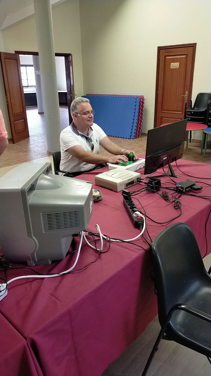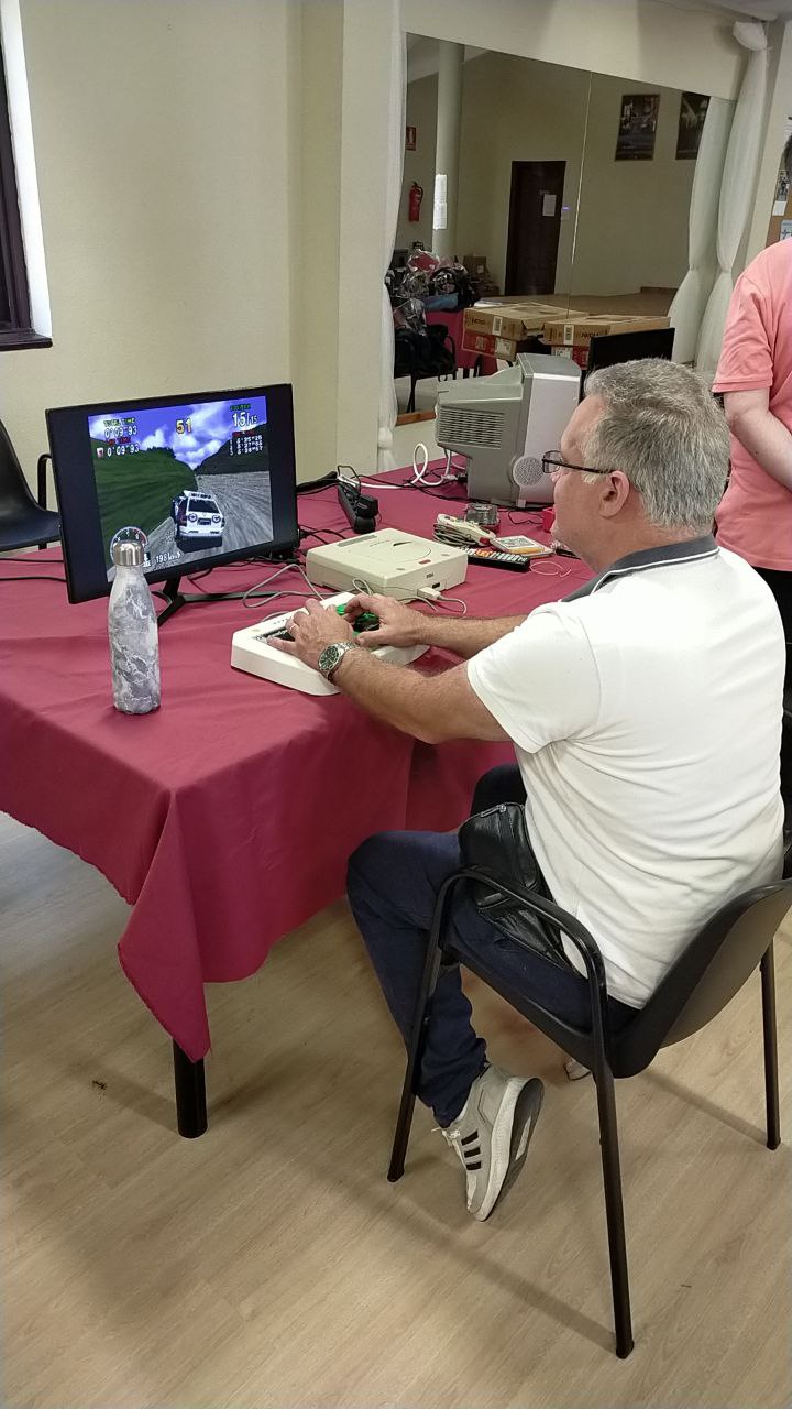 Angelo trajo una Sega Dreamcast, con mando arcade original, donde hizo las delicias de todos los presentes con el Sega Rally.