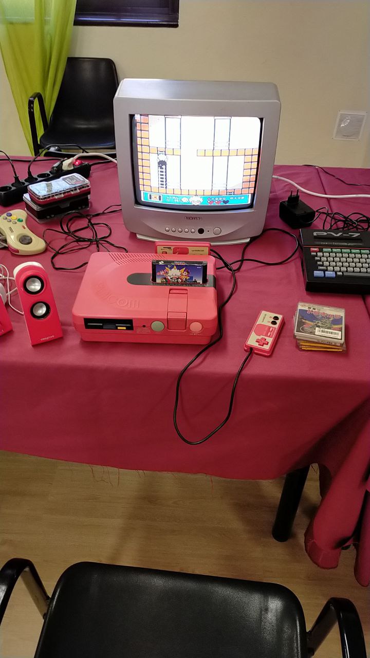 - Nintendo Famicom con disquetera integrada, traída por DarND. Aunque la disquetera estaba inoperativa debido a la correa desgastada, permitió pruebas y discusiones técnicas sobre su reparación futura.