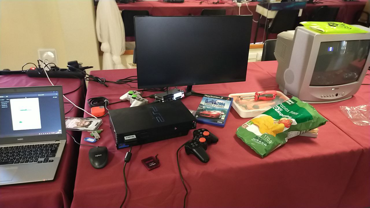 Y por que no sólo de retro vive el hombre, se trajo una PS2, para probar un método de carga de ISOS de esta consola que resultó totalmente funcional, mientras devorábamos sin piedad bolsas de papas fritas.