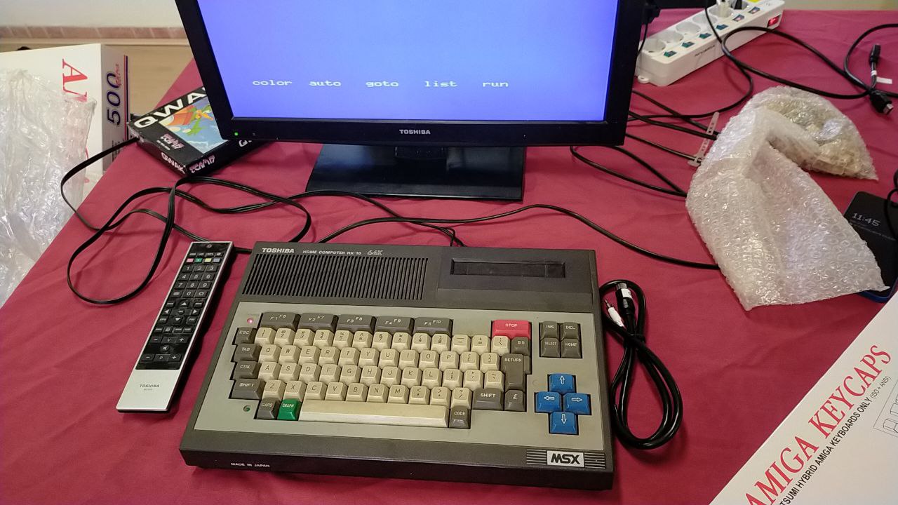 Miguel, además, presentó un MSX1 Toshiba HX-10, uno de los primeros modelos fabricados por la compañía japonesa. Su arquitectura sencilla y su teclado mecánico lo convierten en una máquina ideal para experimentar. Junto con Nivaria, probaron una disquetera MSX externa, logrando cargar varios títulos clásicos sin inconvenientes.