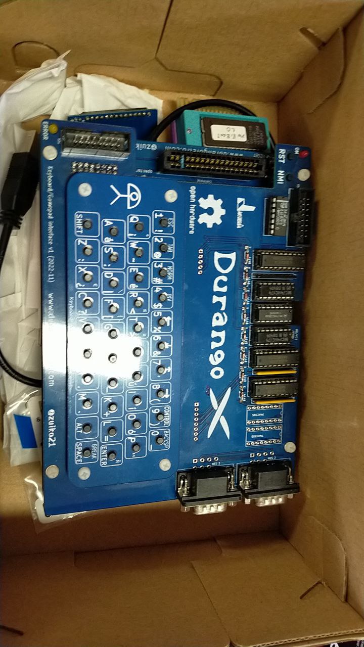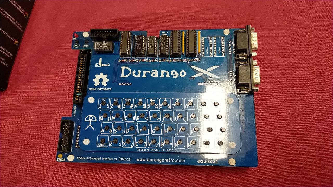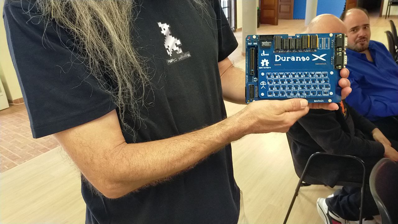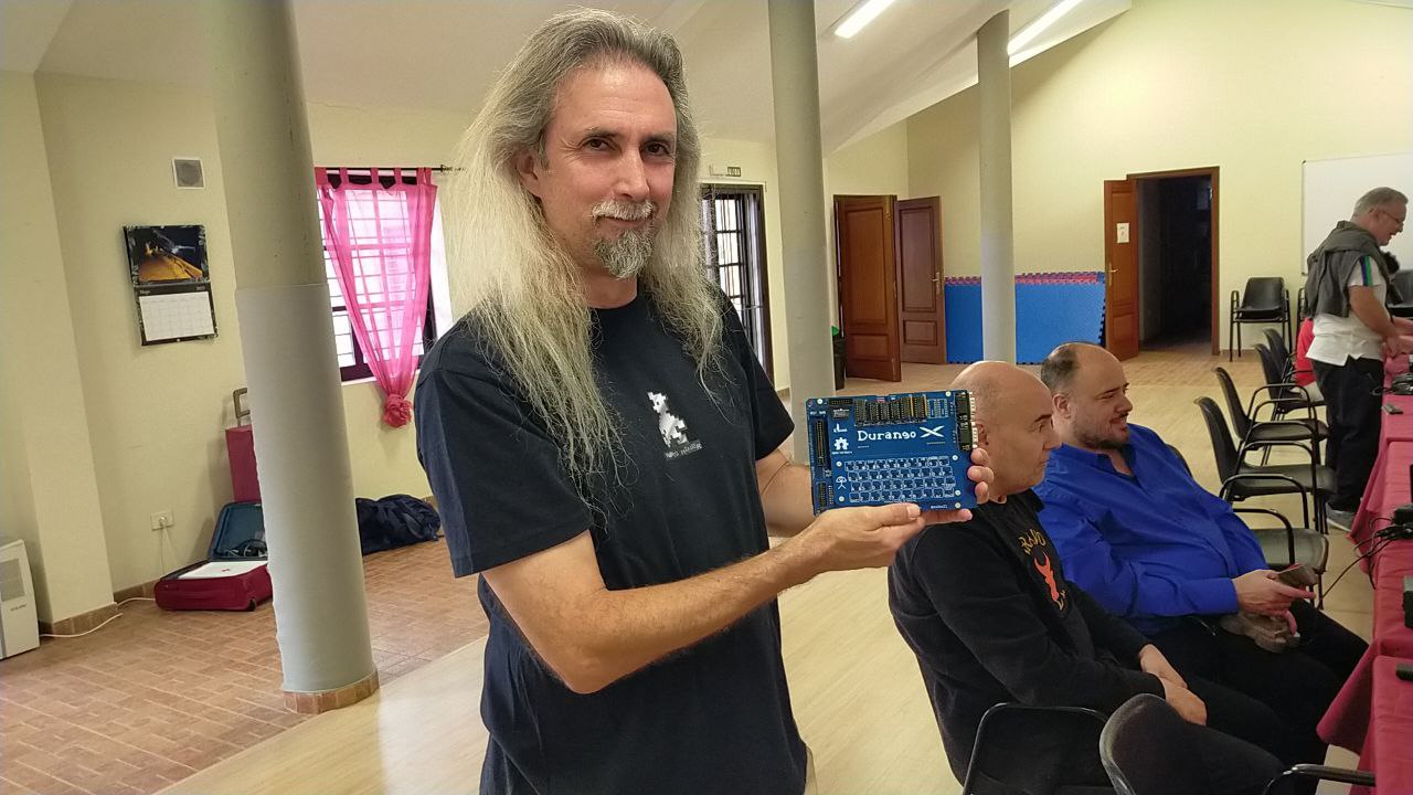 Entre los asistentes destacó Kempstom, uno de los miembros más activos de la comunidad, conocido por organizar el peculiar concurso del “Peor Juego del Año para Spectrum”. Esta vez acudió con un prototipo verdaderamente interesante: el Durango X, un ordenador moderno de arquitectura abierta tanto en hardware como en software, desarrollado para enseñar programación y fomentar la creación de videojuegos retro.