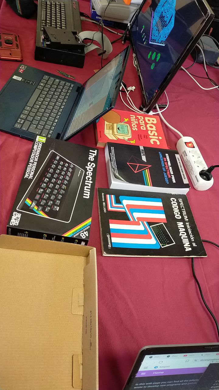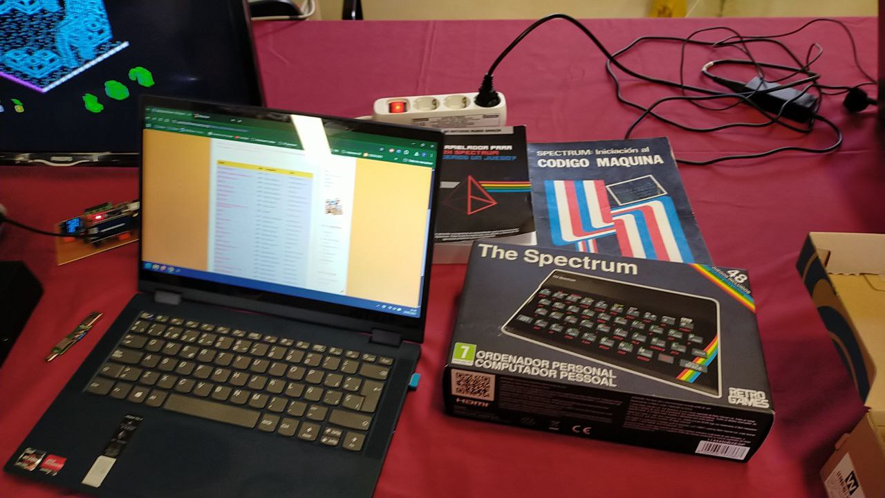 Ayoze aportó un toque tanto nostálgico como moderno. Llegó con varios manuales, revistas y libros originales de ZX Spectrum, ese ordenador británico que definió toda una generación de programadores domésticos. Pero además trajo la flamante The Spectrum, una reinterpretación moderna del clásico microordenador, fabricada por Retro Games Ltd. (la misma compañía responsable de The C64 Mini y The A500 Mini). Este nuevo dispositivo, de reciente lanzamiento, incluye 48 juegos preinstalados, una interfaz HDMI moderna, y la posibilidad de cargar más títulos mediante puertos USB y pendrives, combinando lo mejor del pasado con la comodidad del presente. Durante la reunión, varios asistentes se turnaron para explorar sus menús, disfrutar de los juegos y comprobar su fidelidad a la experiencia original del Sinclair.