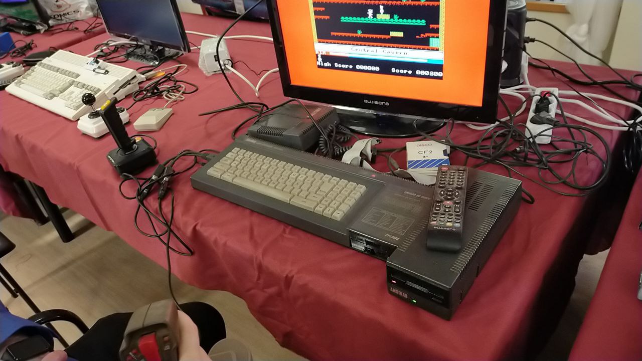 Todo ello, alimentado con una fuente de alimentación original de Amstrad, daba un aire auténtico a la experiencia. En pantalla, el clásico Jet Set Willy —uno de los títulos más icónicos del ZX Spectrum y portado a múltiples sistemas— volvía a cobrar vida, evocando aquellas tardes de finales de los ochenta frente al monitor verde fósforo.