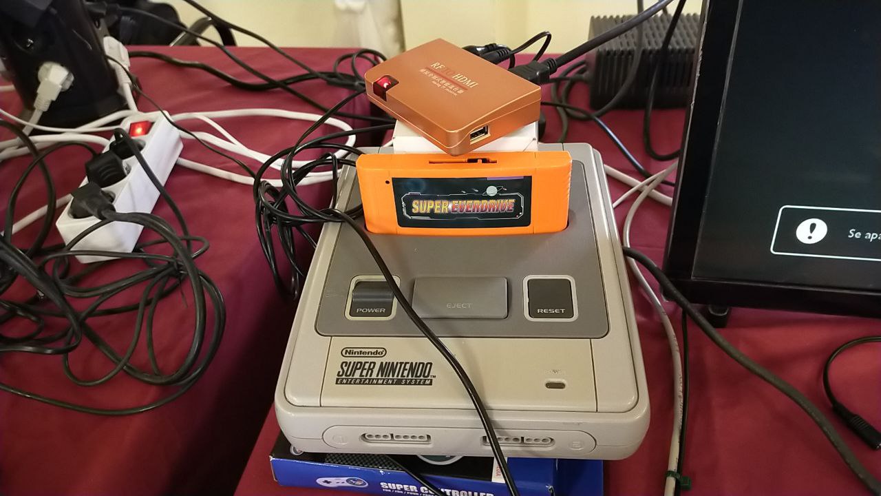 Además, Ayoze sorprendió con una Super Nintendo (modelo PAL original) equipada con un cartucho Super EverDrive, un dispositivo basado en FPGA que permite cargar ROMs desde una tarjeta SD. Lo más curioso era su carcasa: una pieza impresa en 3D diseñada por él mismo para proteger la placa y mantener la estética de los cartuchos originales.