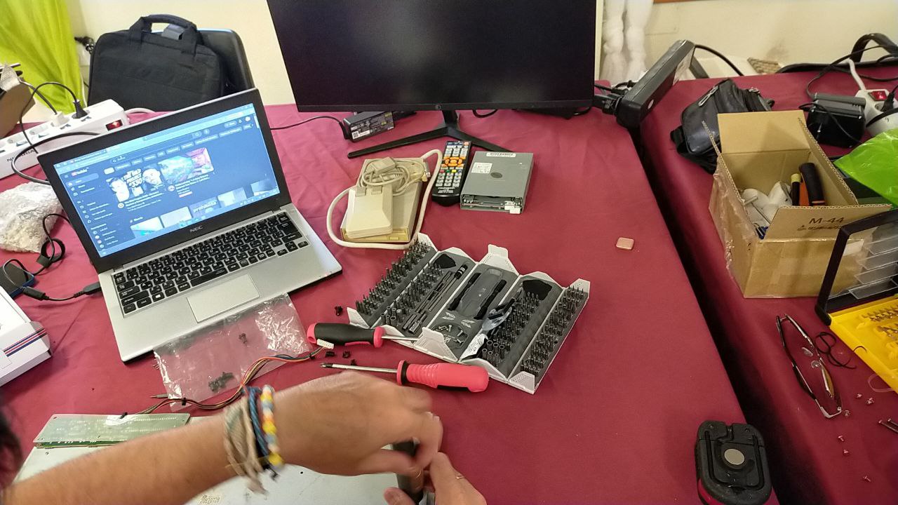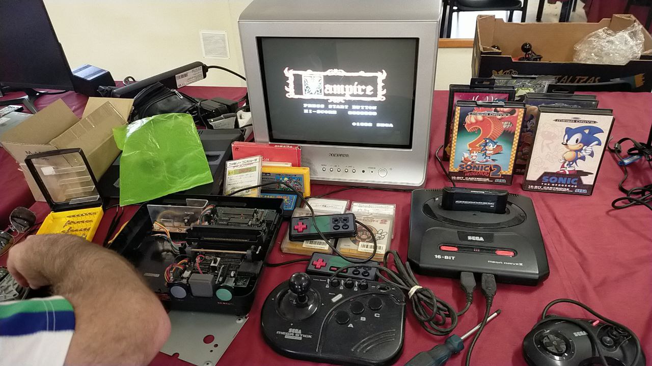 Por su parte, DarkND trajo una Sega Mega Drive con EverDrive y una tarjeta microSD repleta de clásicos como Sonic the Hedgehog 1 y 2. También presentó un arcade stick Fighter original de la época, muy apreciado por los jugadores más exigentes. Parte de la jornada la dedicó a reparar una consola Famicom (la versión japonesa de la NES), que presentaba fallos de vídeo intermitentes. Armado con soldador, destornilladores y paciencia, pasó buena parte del encuentro en modo “técnico de guardia”, algo que ya se ha vuelto habitual en estas reuniones.