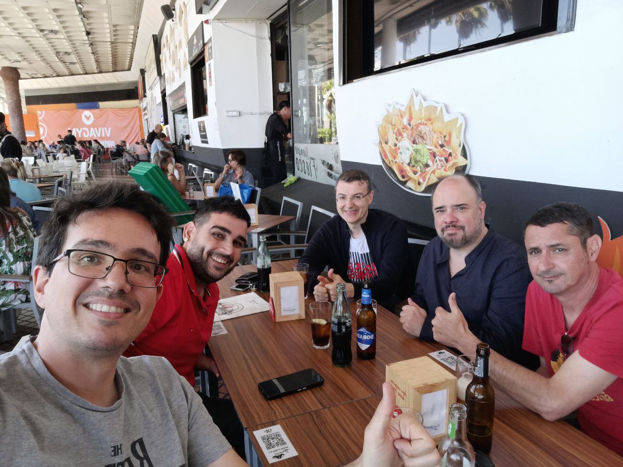 Alrededor del mediodía, la marea de bits dio paso a la marea de estómagos vacíos. La comitiva se dirigió al cercano centro comercial, donde la estrella gastronómica fue una pizza de dos metros, con la que no nos andamos con contemplaciones. La comparación fue inevitable: “parecía un cadáver extendido sobre la mesa”, comentaban entre carcajadas.